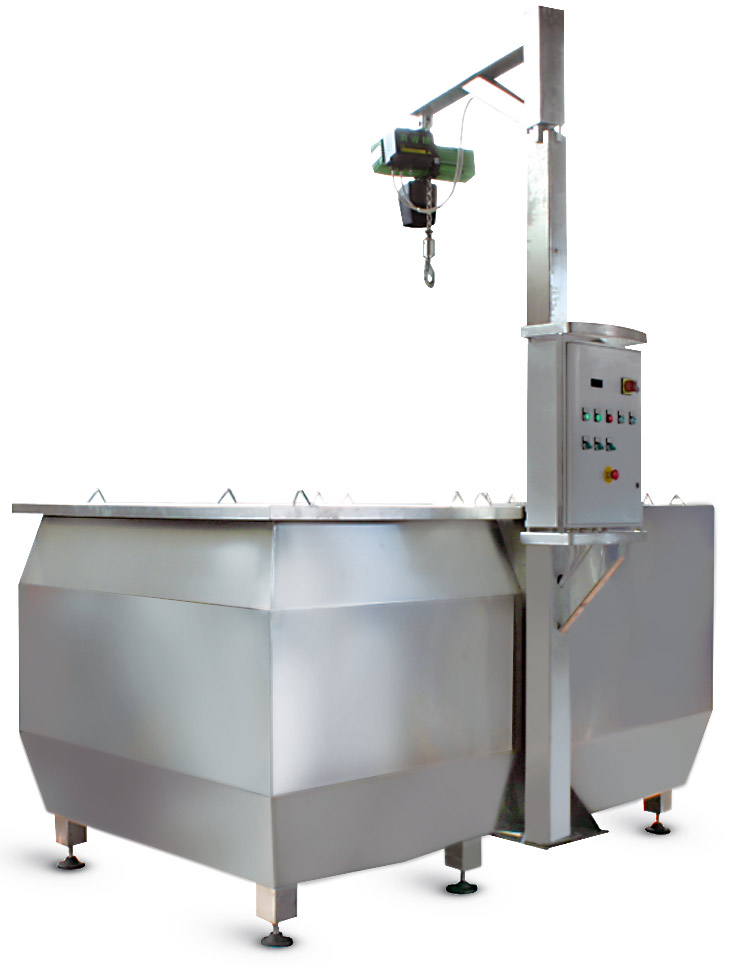 The machine is equipped with an electric cantilever arm to lift baskets/trolleys and put them inside the washing tanks.